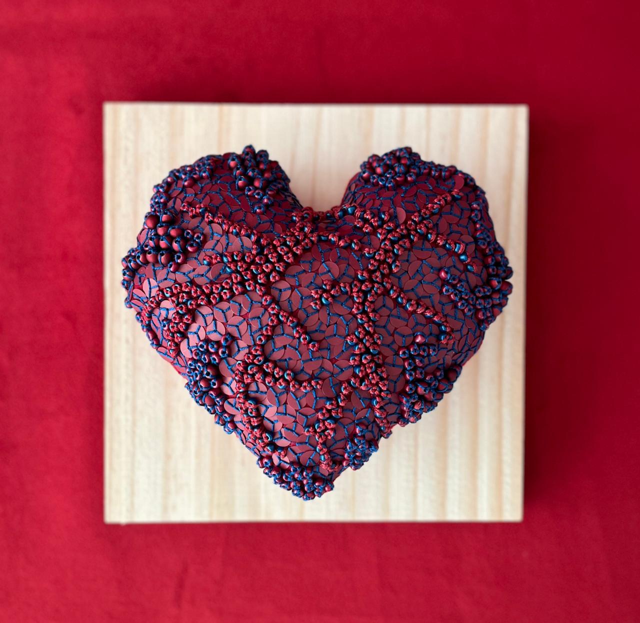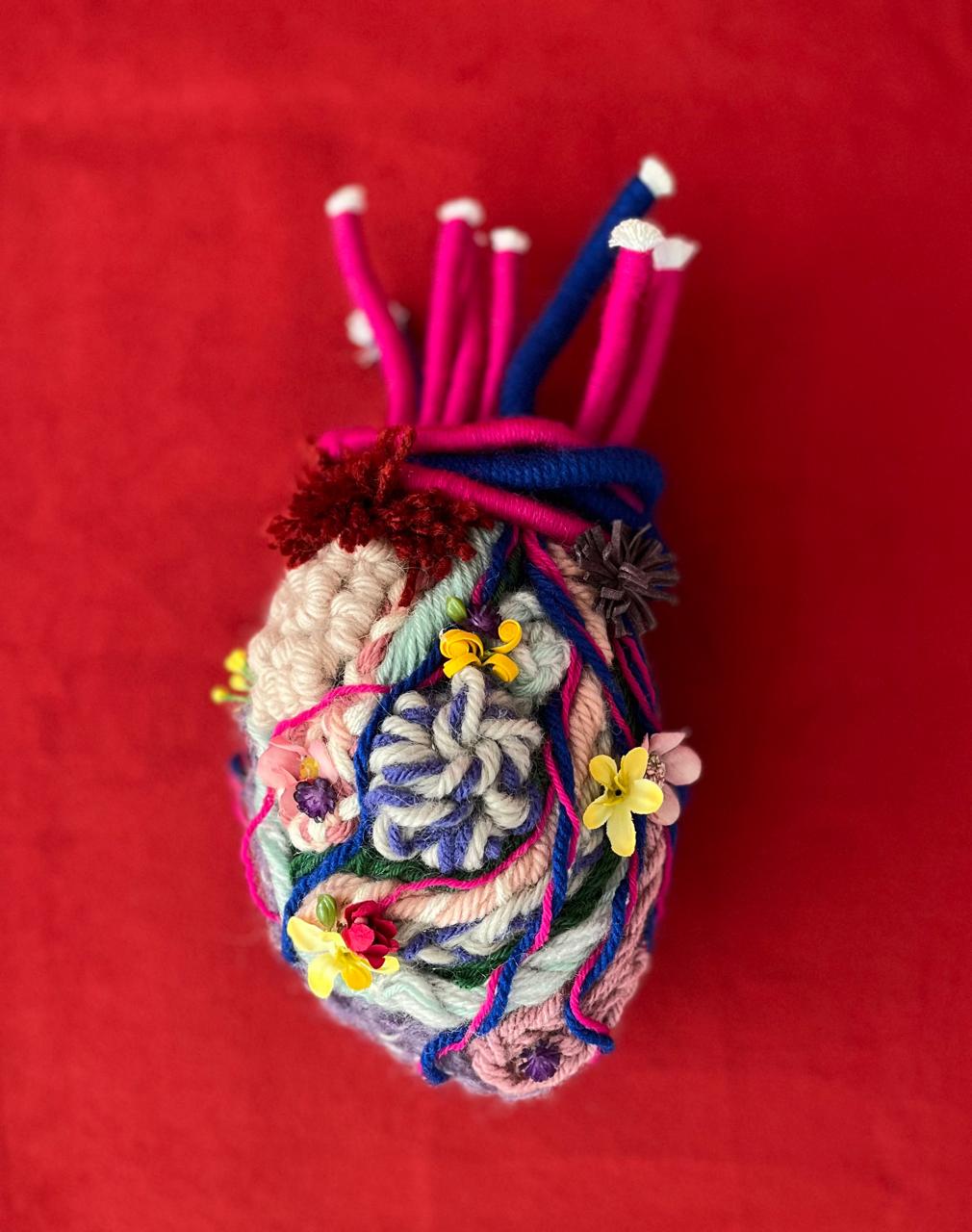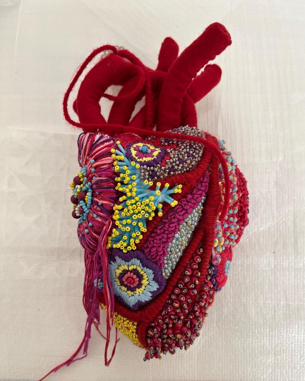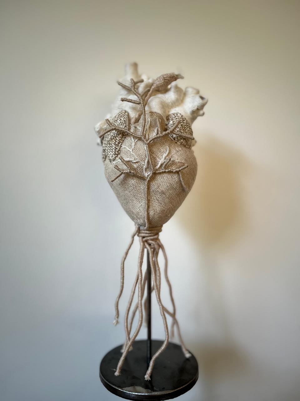 Os corações surgiram quando começou a fazer representações do Sagrado Coração de Maria e de Jesus. Depois, passou a trabalhar com corações de papel machê, o que ampliou ainda mais seu leque de possibilidades, até chegar ao formato do coração humano – o miocárdio.