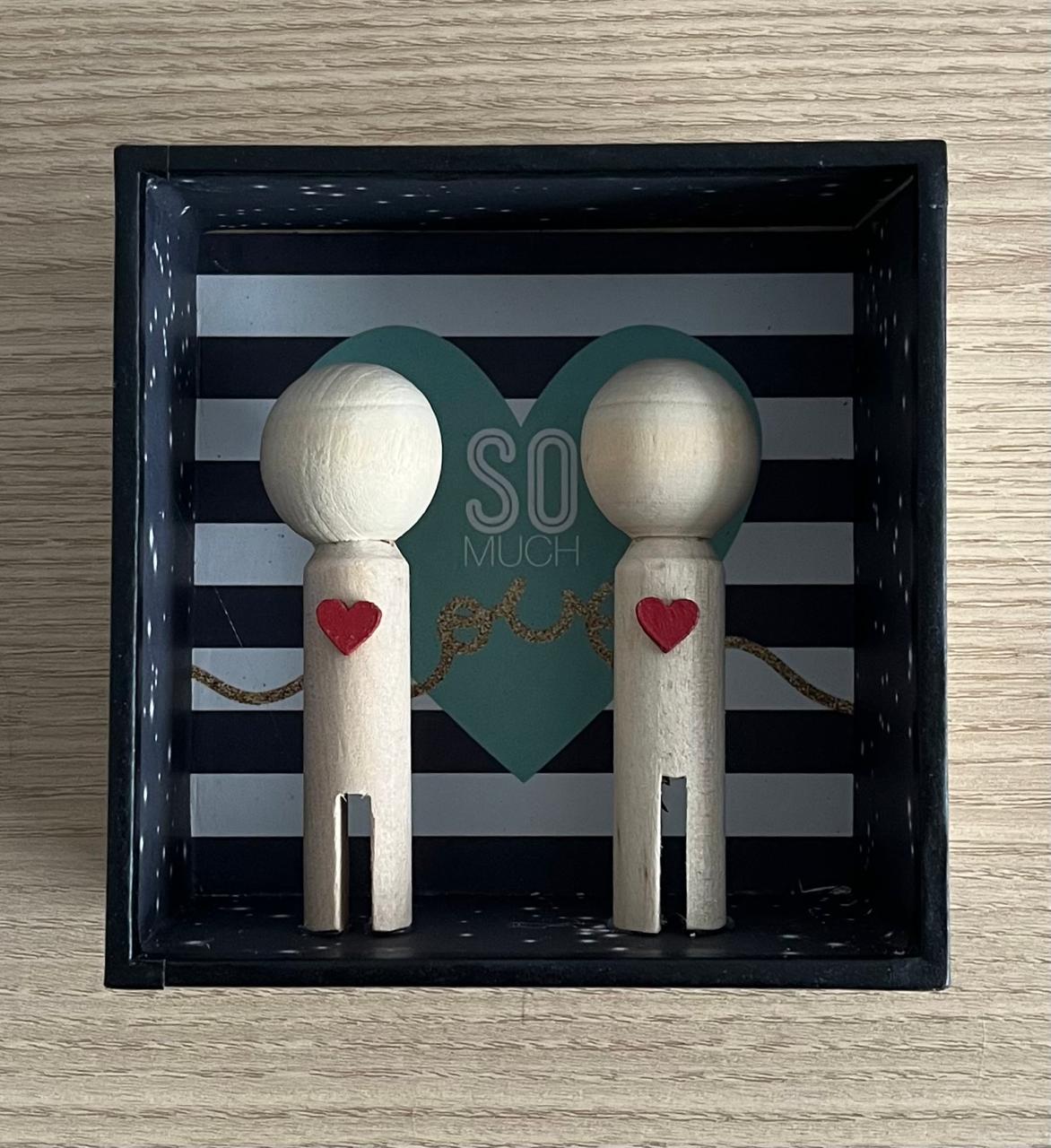Casal em madeira inserido em caixa de madeira revestida em papel.