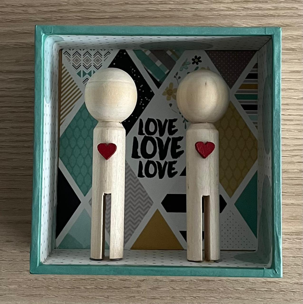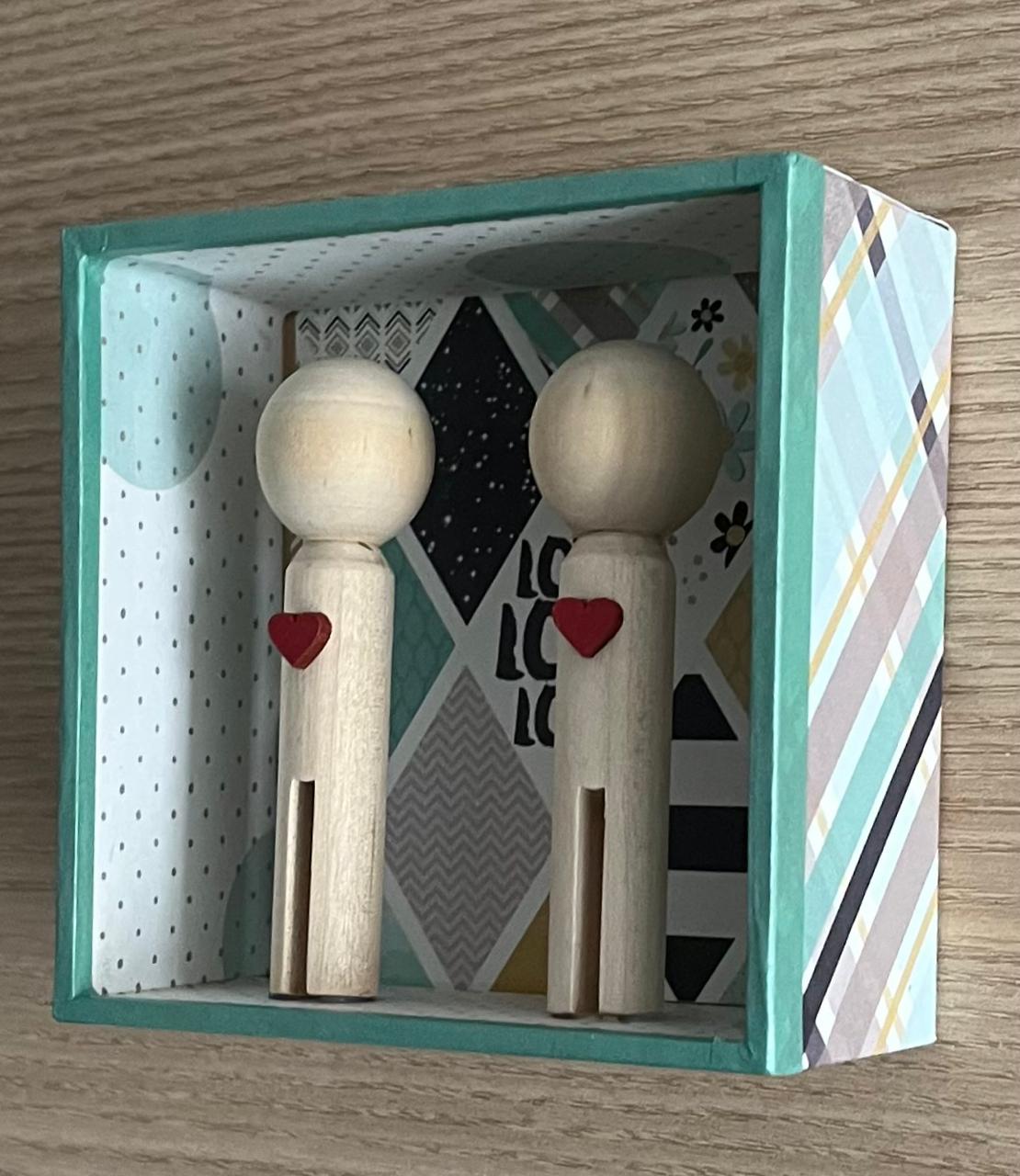 Casal em madeira inserido em caixa de madeira revestida em papel.