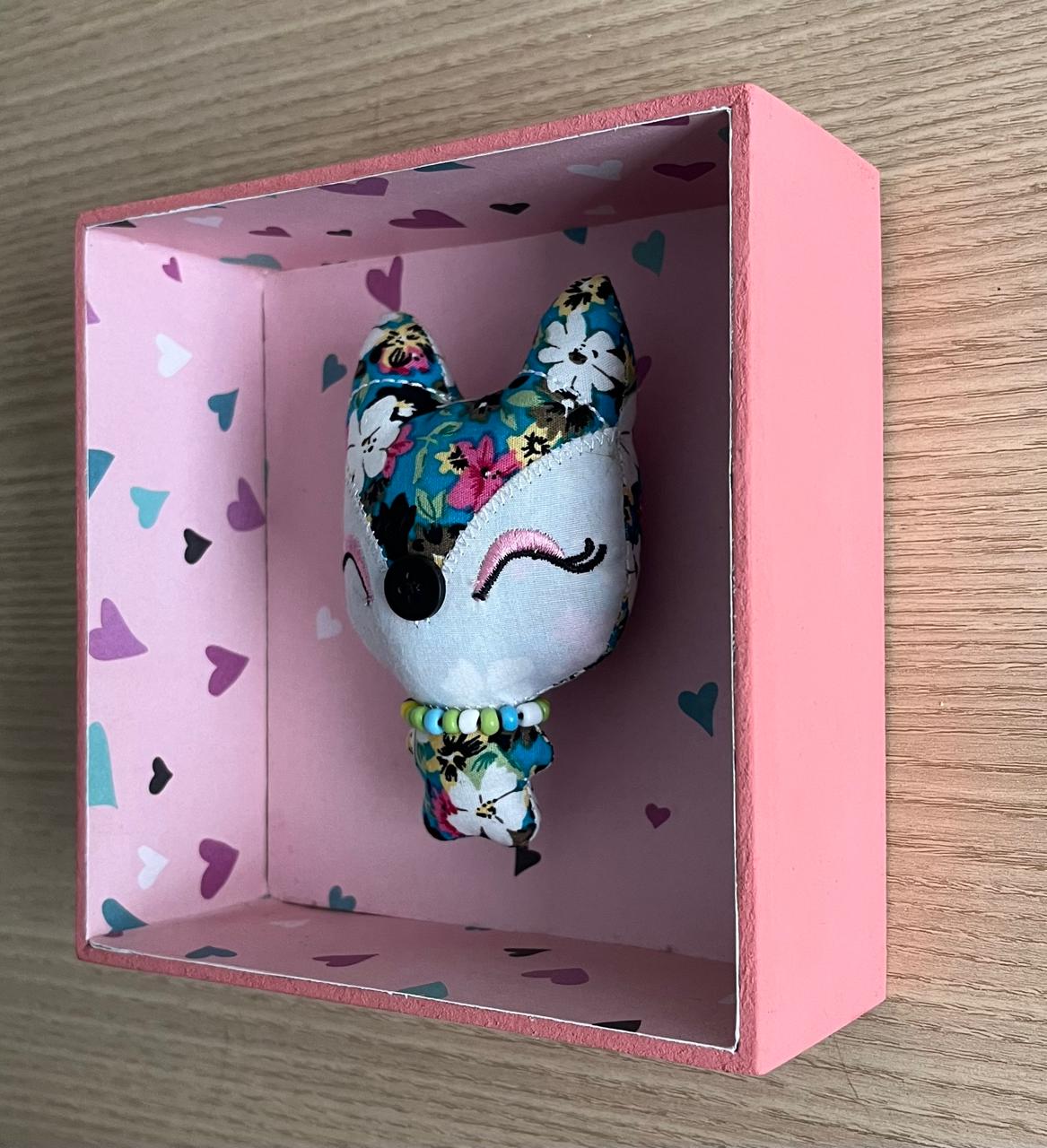 Caixa de madeira revestida em papel no interior, no exterior pintada na cor rosa. Gatinha em tecido.