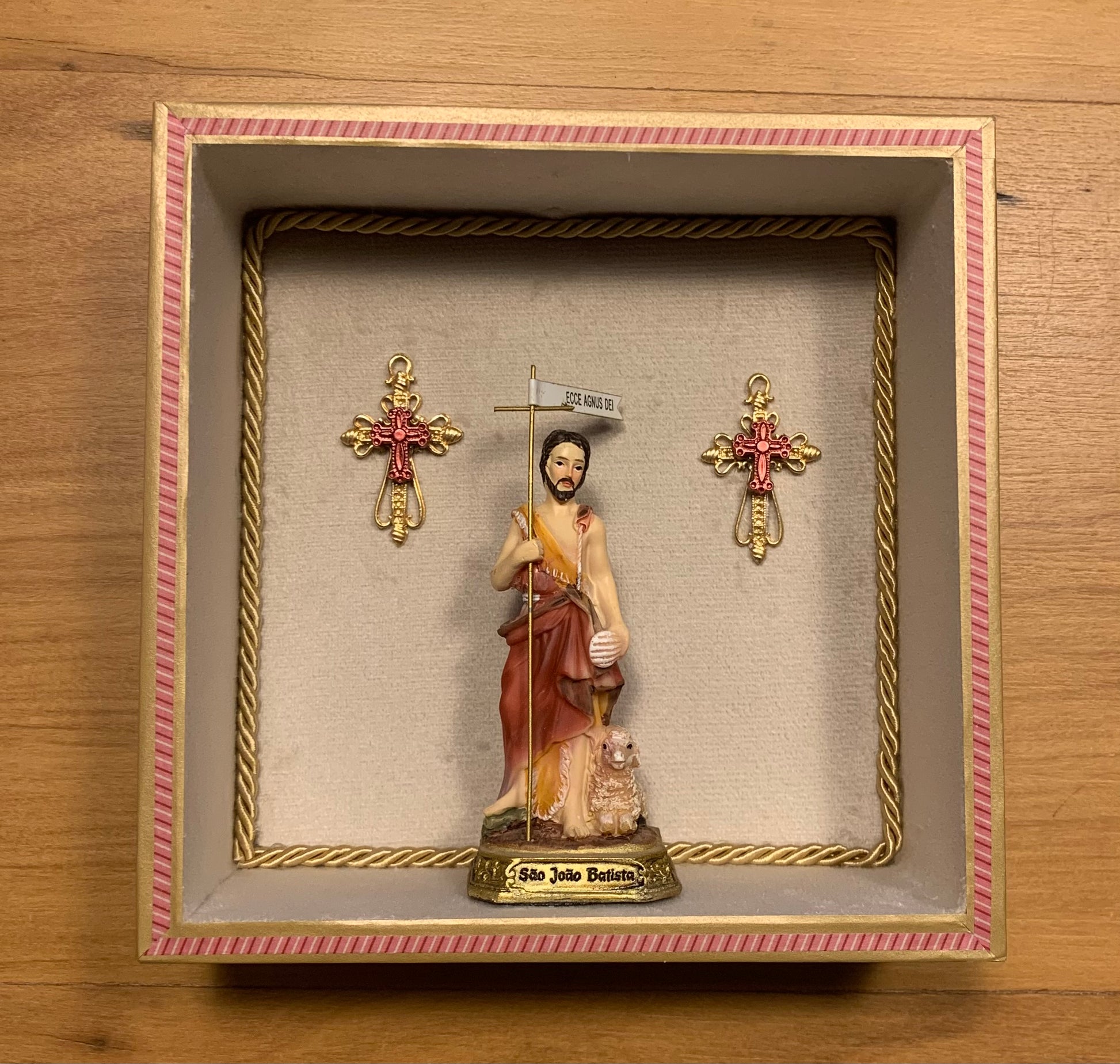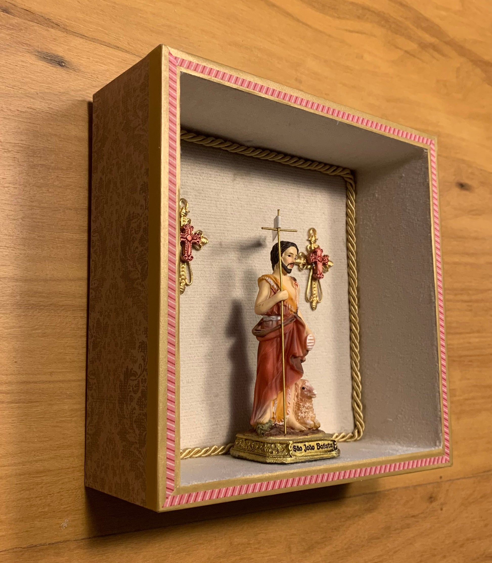 Imagem em resina de São João Batista inserida em caixa de madeira revestida com tecido e papel. Caixa com tampa de acrílico