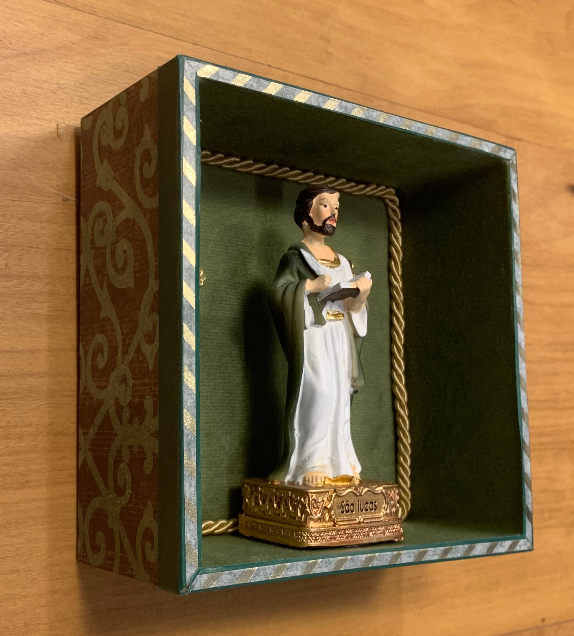 Imagem em resina de São Lucas inserida em caixa de madeira revestida com tecido e papel.
