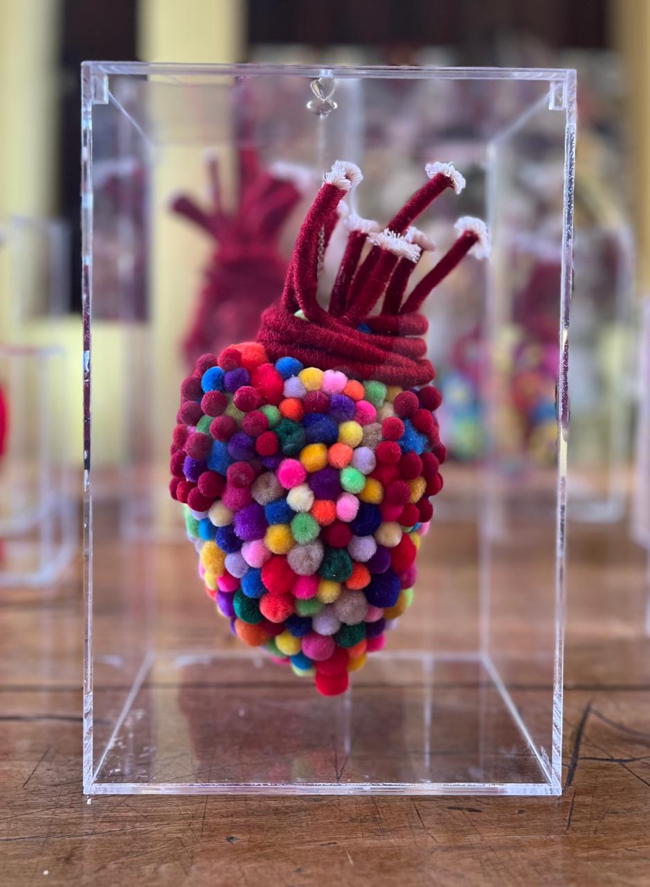 Coração em tecido ornado com pompons. Inserido em caixa de acrílico.