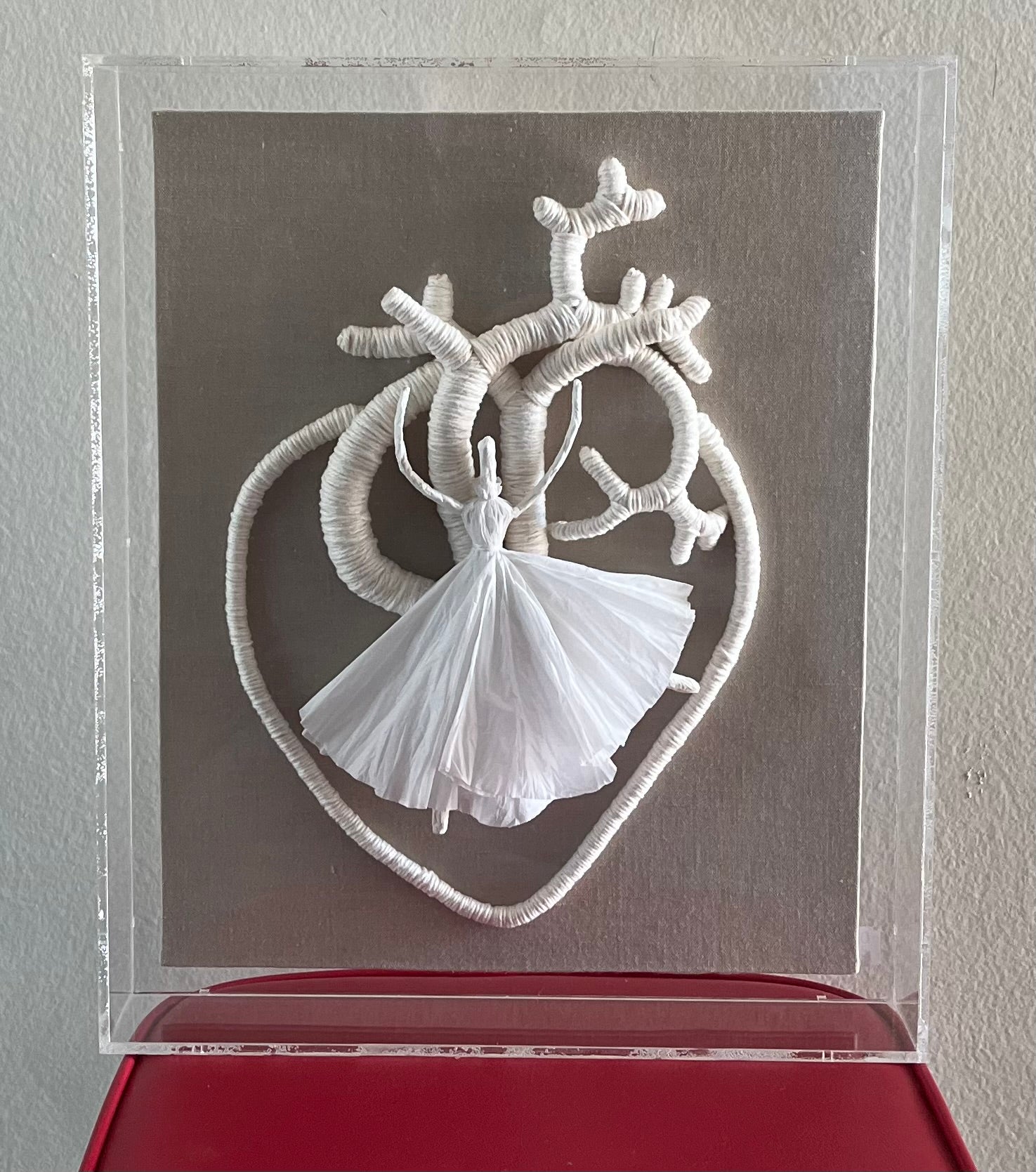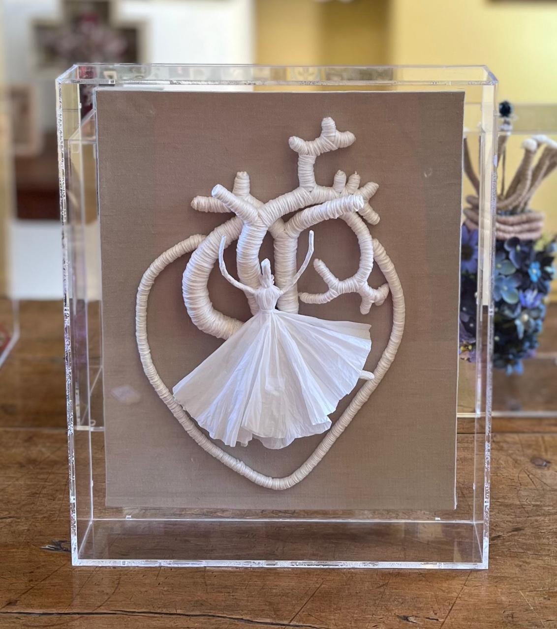 Coração bordado em tecido inserido em uma caixa de acrílico