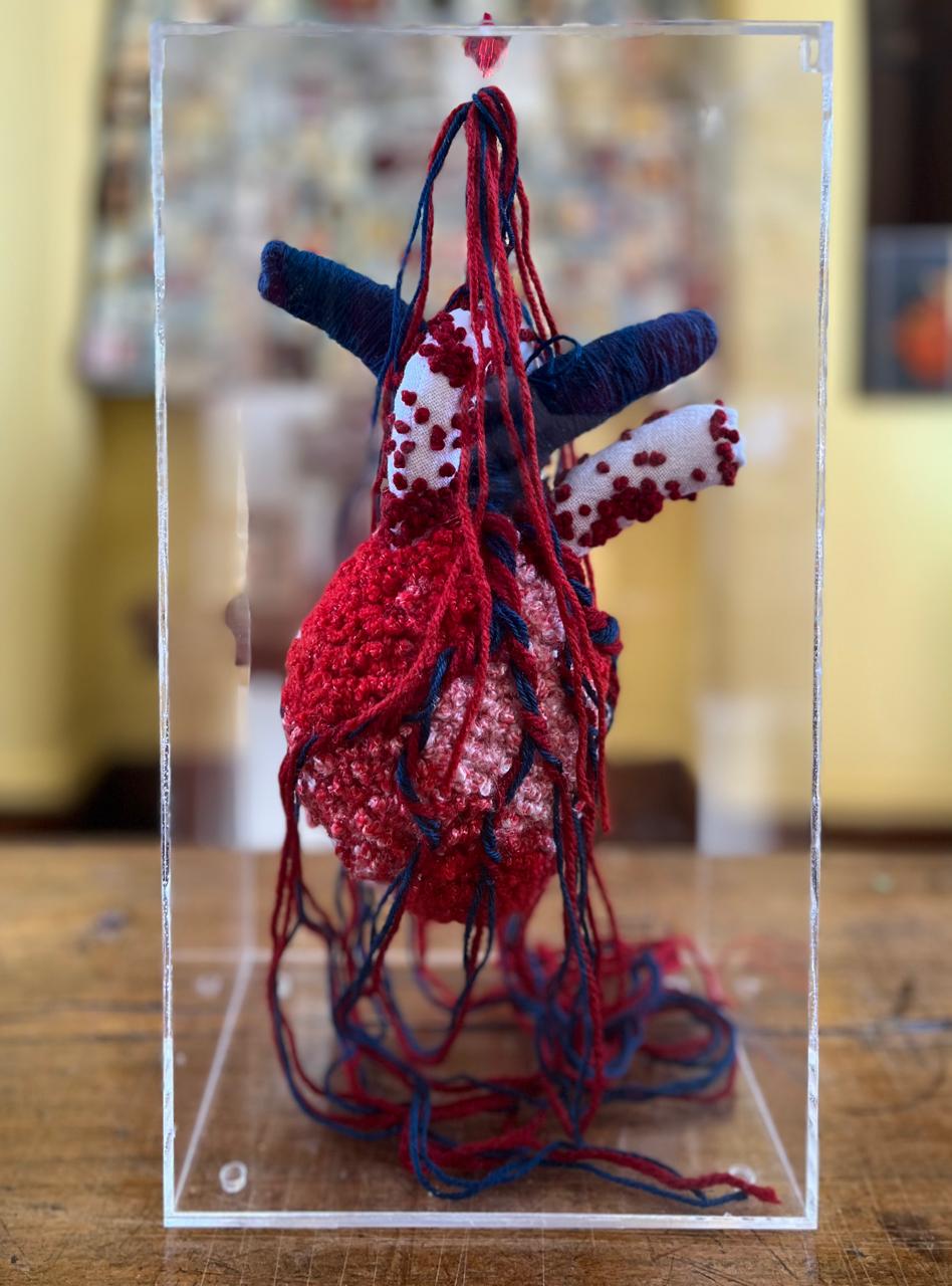 Coração bordado em tecido inserido em uma caixa de acrílico