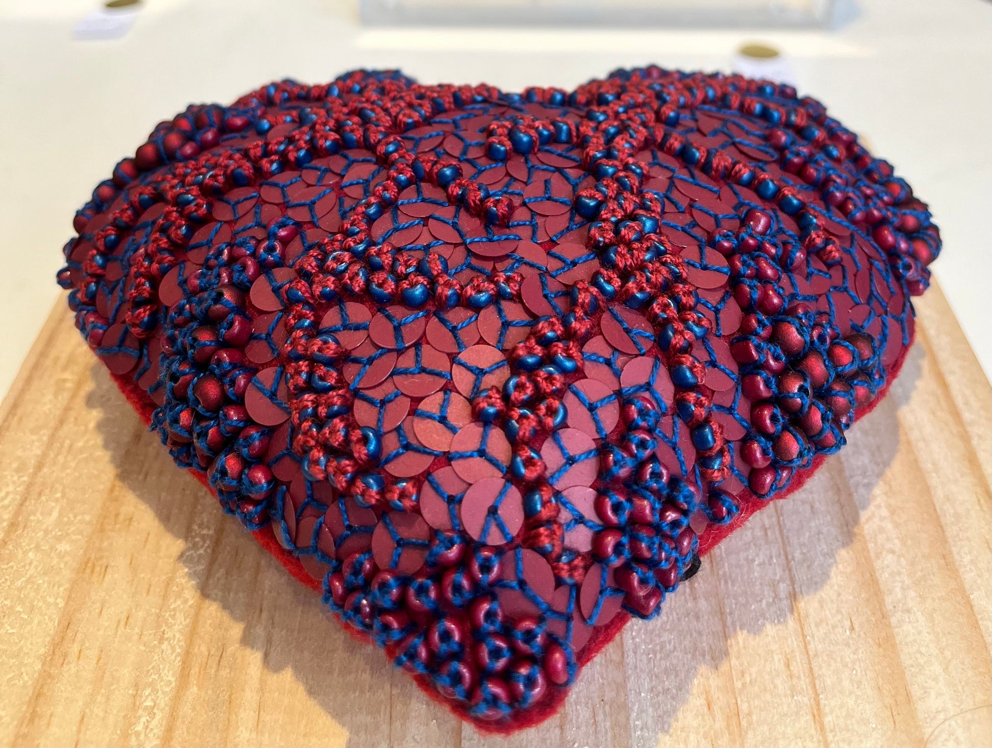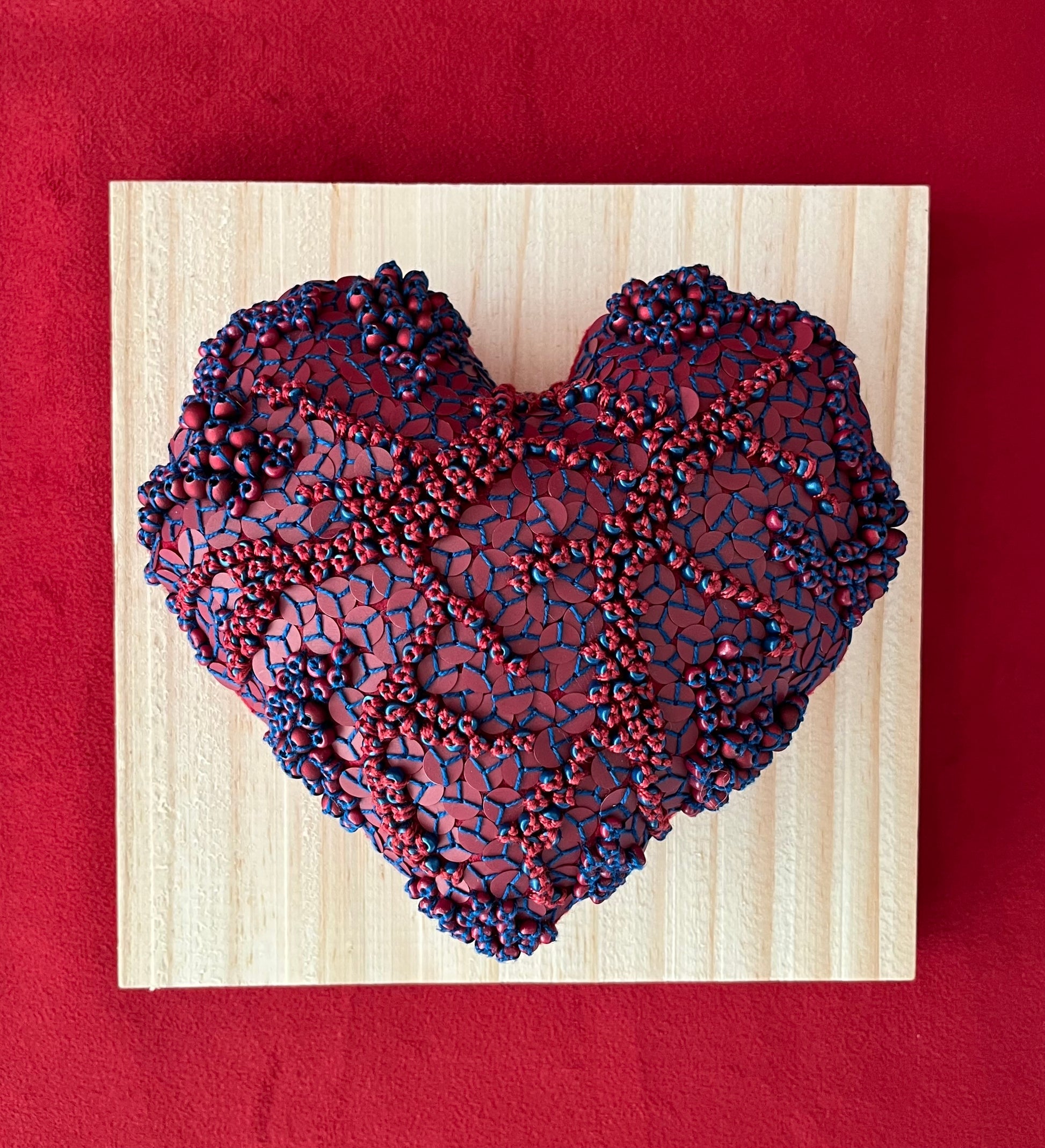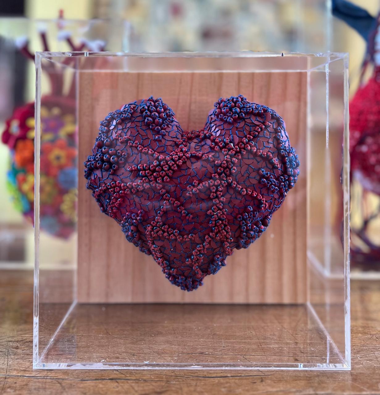 Coração bordado em tecido inserido em uma caixa de acrílico