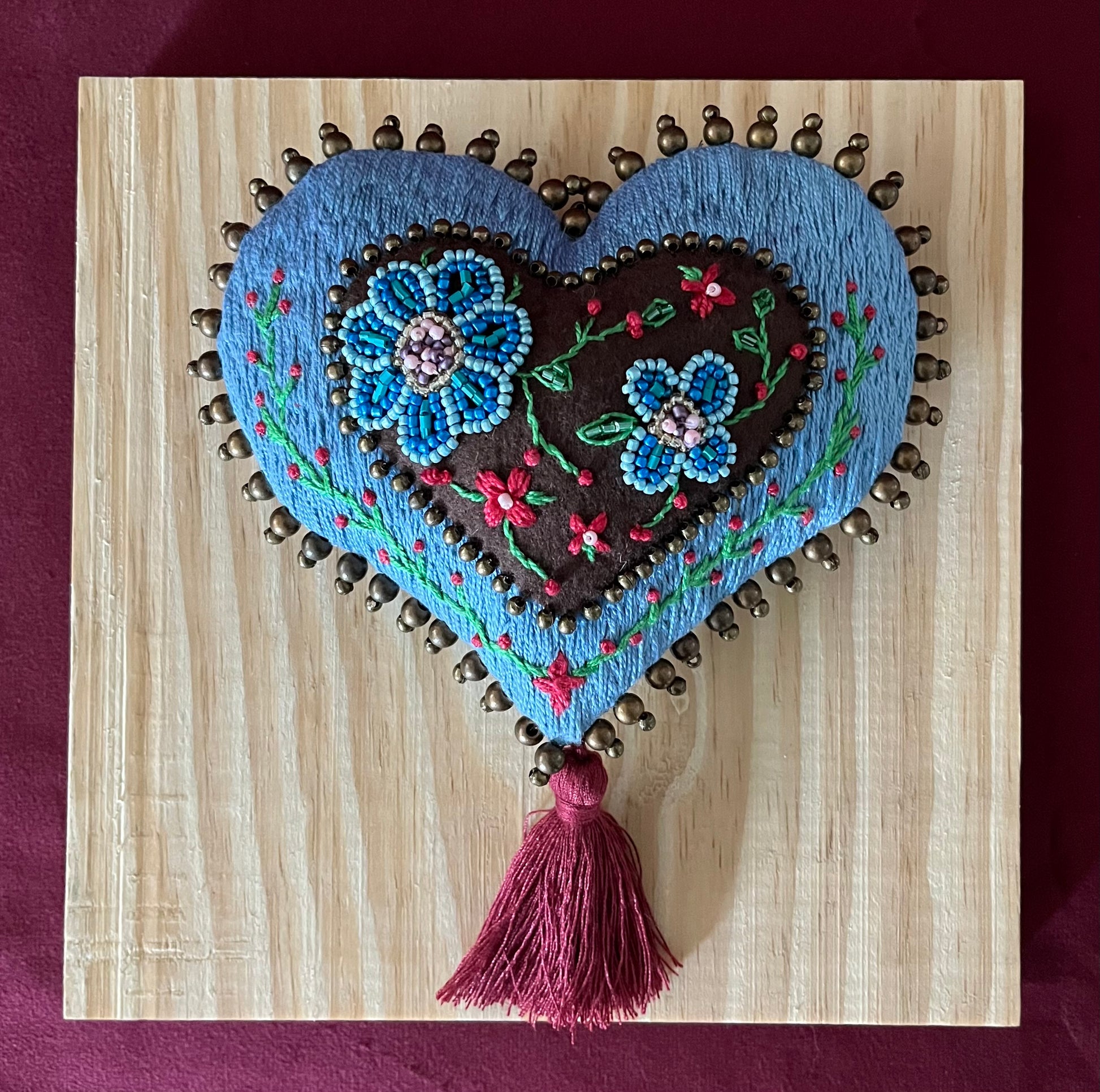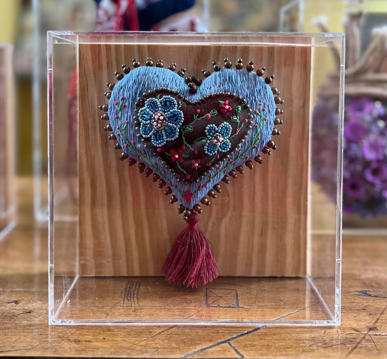 Coração bordado, fixado em base de madeira e inserido em uma caixa de acrílico