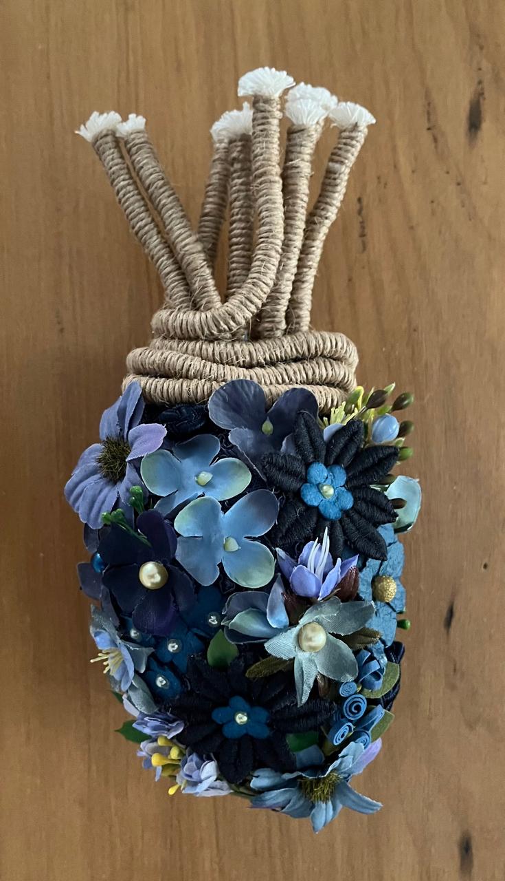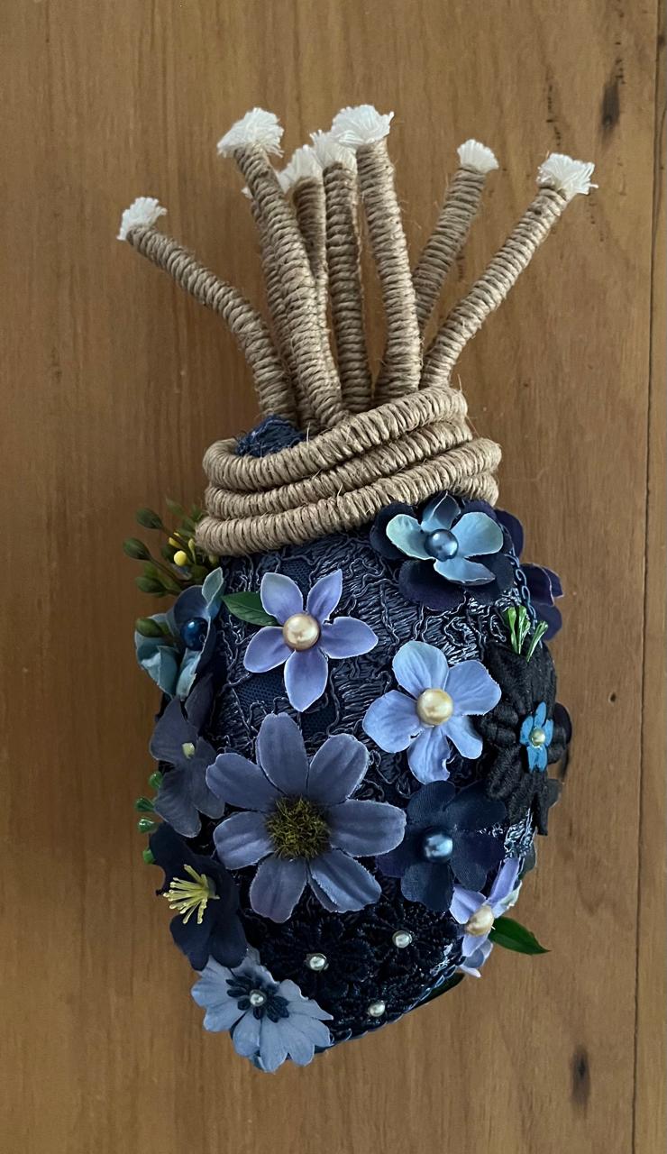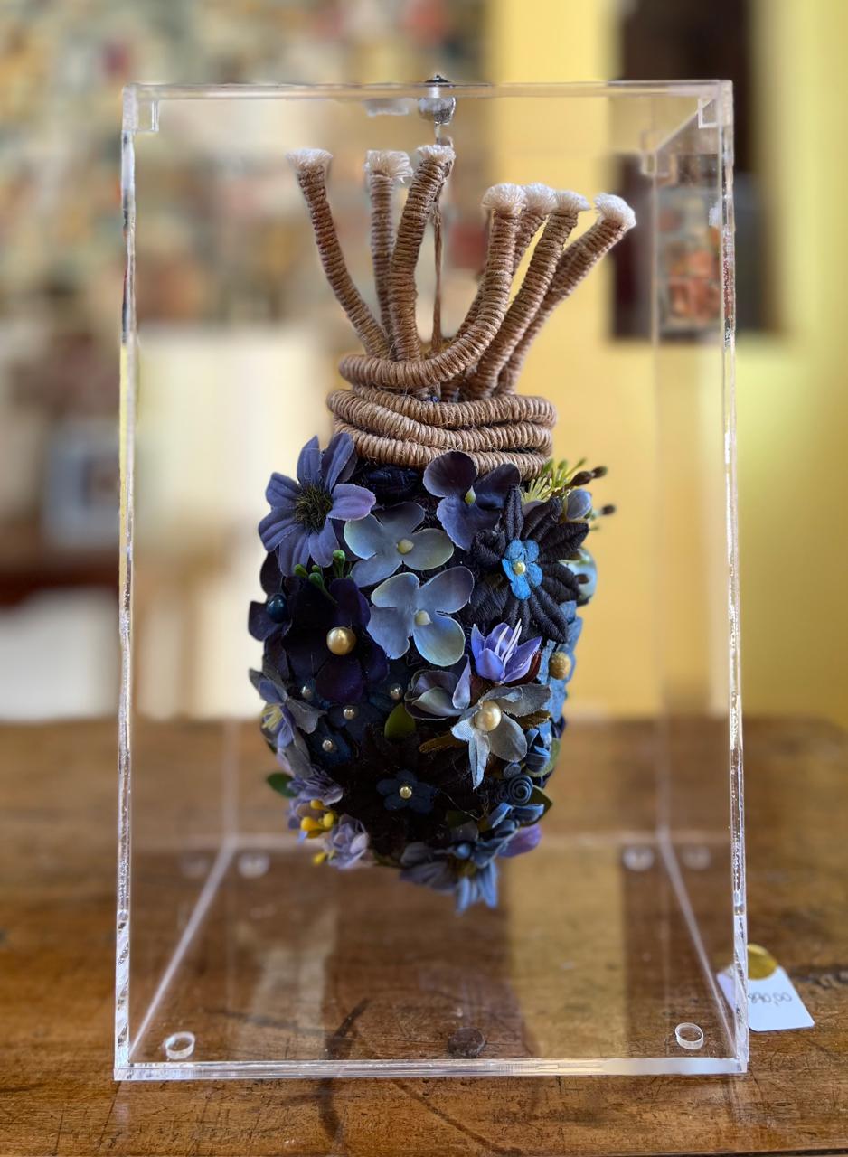 Coração em tecido ornado com diversos tipos de flores e outros adereços. Inserido em caixa de acrílico.